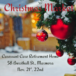 Christmas Market Join Mindful Journey at the lovely Caressant Care Retirement Home ... 21 Nov 10:00 am - 3:00 pm Caressant Care Retirement Home58 Bursthall Street, Marmora, ON