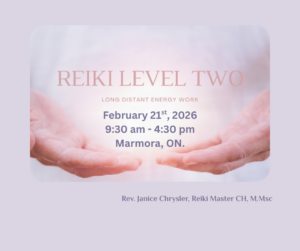 Reiki Level Two Workshop will take place February 21st, 2026, from 9:30 am – 4:30 pm, at 52 Victoria Ave, Marmora, On. Rev. Janice Chrysler,…